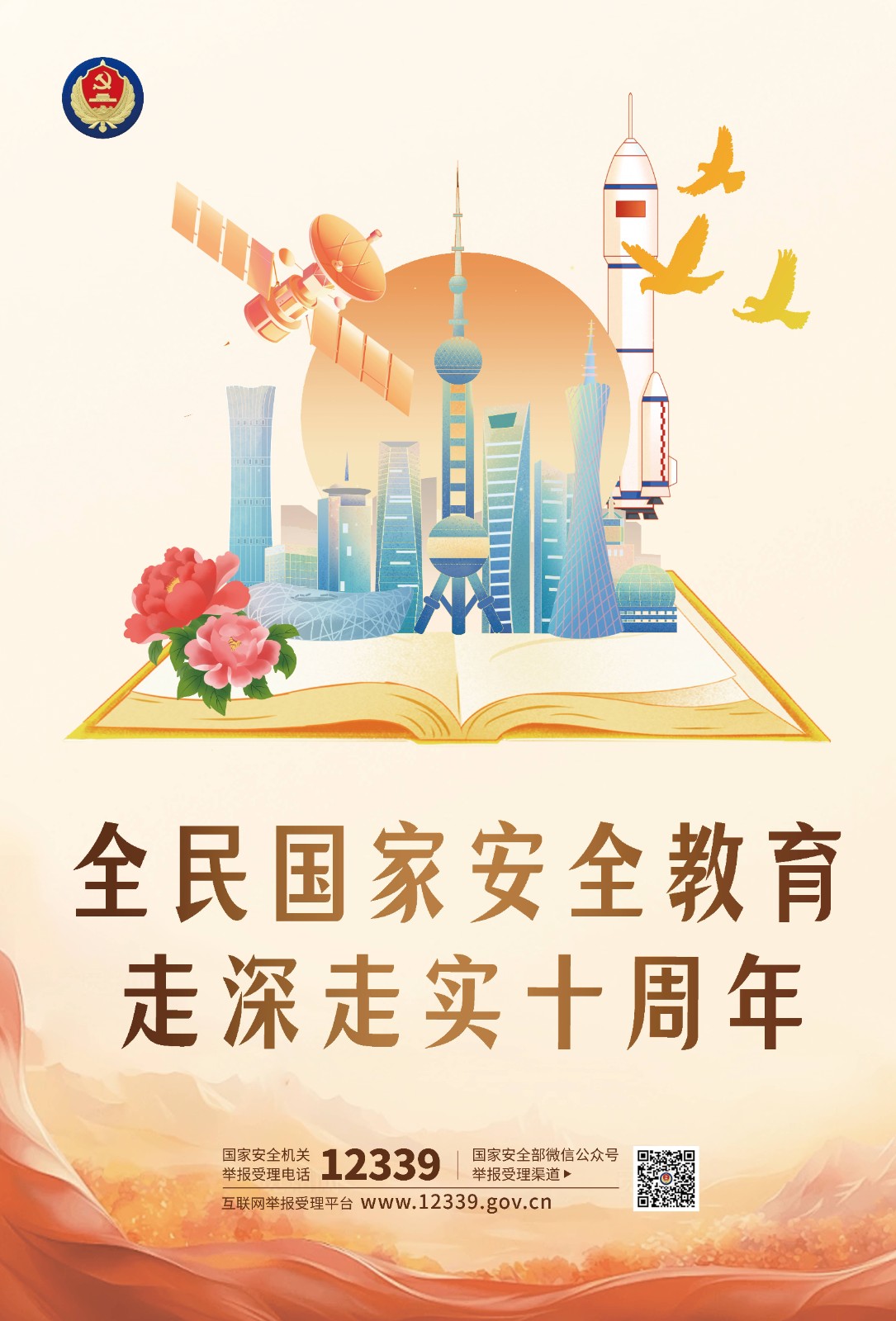 2025年4月15日是第十個全民國家安全教育日,今年的主題是:全民國家安全教育,走深走實十周年。國安宣工作室發(fā)布系列海報,強調(diào)要堅定不移貫徹總體國家安全觀,推進國家安全體系和能力現(xiàn)代化,完善國家安全法治體系,提升國家安全工作法治化水平。